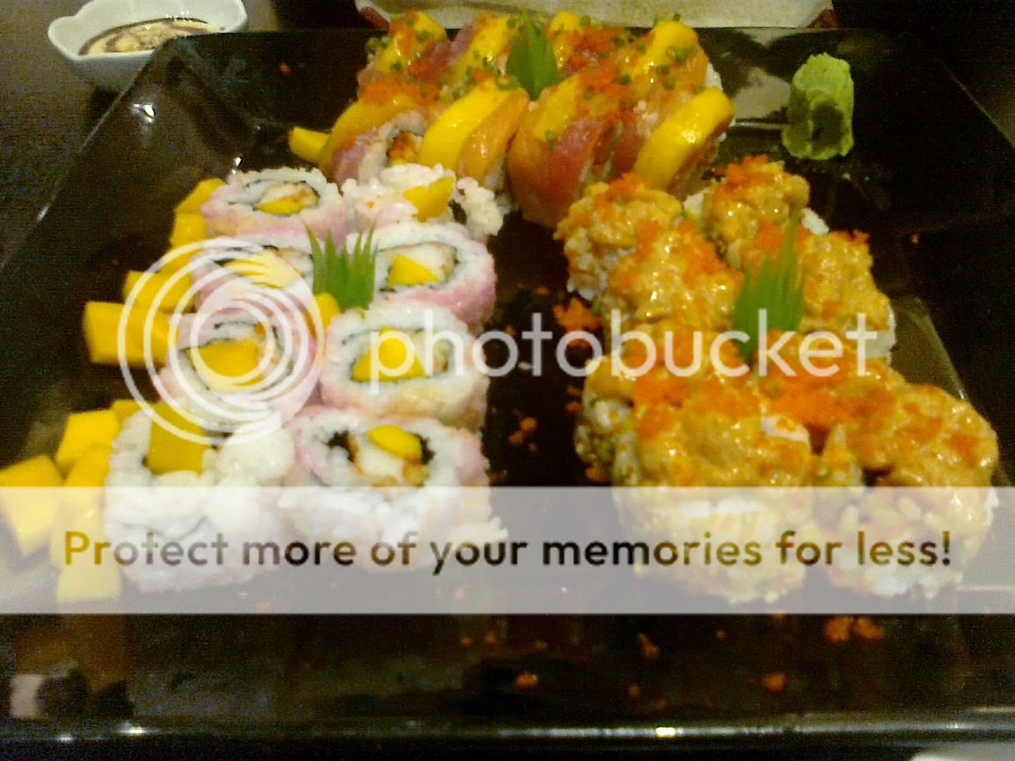 Anyway, the platter came first. GDR basically stood for its contents: Golden sun, Dynamite, and Rising sun rolls. The sauce included was the same as last time: their own mayonnaise with teriyaki sauce topped with sesame. The Rising sun roll, the one at the back, was the one we ordered the last time we went, and it's still divinely delicious, even though they traded their avocado with mangoes, apparently they were out of it as well. The mangoes rendered the roll a bit sweeter than the last time, but it's still a wonderful treat.